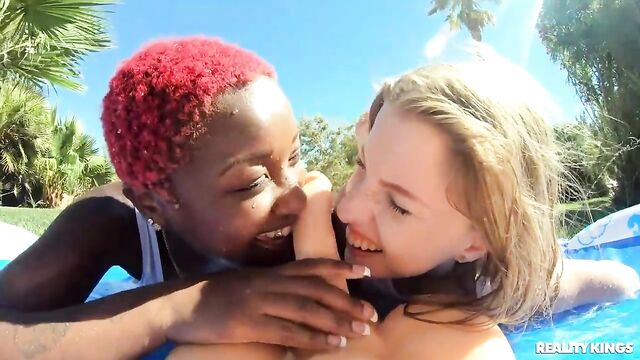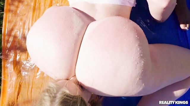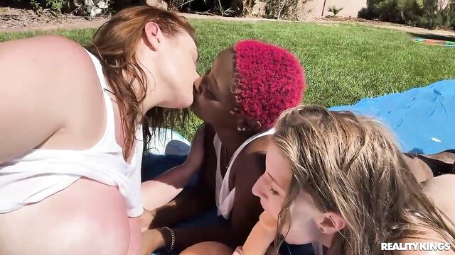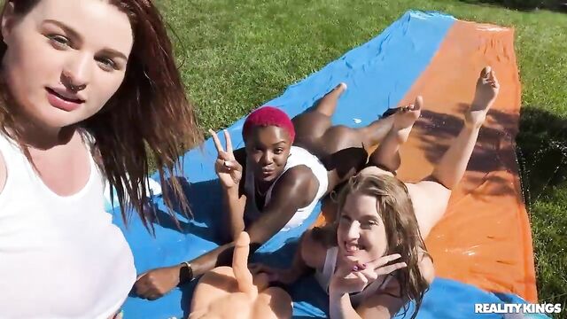 Description:These three girls are all wet, and not just from the pool! Busty hotties Deja Marie, Abigaiil Morris, and Octavia Red splash in the water as they shake their asses, squirt each other's big tits with water guns, and hose one another down. Abigaiil has a surprise for the other babes: a big cock toy for them to suck and ride on the slip and slide! This sexy threesome makes good use of the toy as they lick each other's pussies and show just how wet they really are.