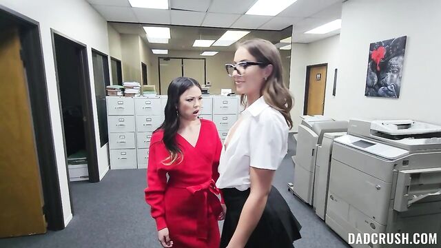 Description:For her big college assignment, Lulu needs to observe her stepdad, Allen, while he works. She wants to get into the mind of an executive, but his pesky intern, Violet, keeps getting in the way. Later in the breakroom, Violet shows Lulu that they can have a little fun, too, and licks cookie crumbs off her lips. Allen sees this, so Violet exits the room, and Lulu uses this opportunity to suck her stepdad’s cock. The next day, Violet is up to her usual antics, trying to get Allen’s attention, although she wants Lulu to join in this time. They share an intense threesome right there in the office. Allen fucks Lulu until he busts a load inside of her.