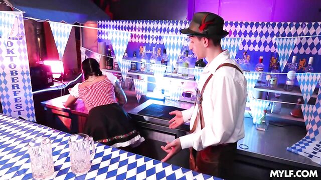 Description:Nick is turning 21 at midnight, so he’s trying to sneak into the Oktoberfest-themed bar around the corner to celebrate. The naive boy tries to blend in and flirts with the hot bartender, Payton, a busty milf who thinks he is cute but definitely not age-appropriate, so she throws him out of the bar. Determined to get in, Nick comes up with a plan: he puts on an outfit and pretends to be another guy. Payton easily sees through Nick’s ridiculous disguise, but the gal is horny and the boy is about to celebrate his 21st birthday, so she might give him a birthday present as well!