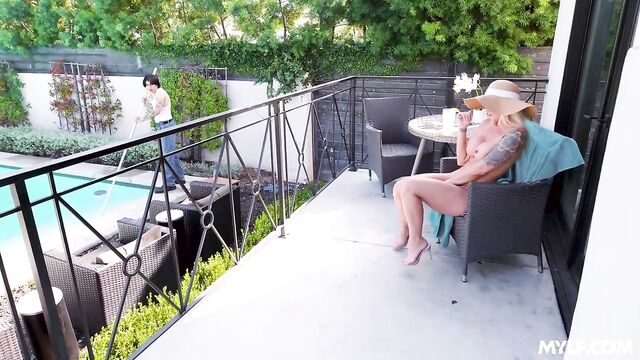 वर्णन: Alexis is a lonely housewife whose husband is constantly away from home. Her weekends usually involve her doing the house chores all by herself. Yet, one day, she realizes that Elias, a horny and eager neighbor, likes peeping into her backyard, so she starts putting on a show for him. Soon, the boy will learn what vivacious homemakers do when their husbands are not around.