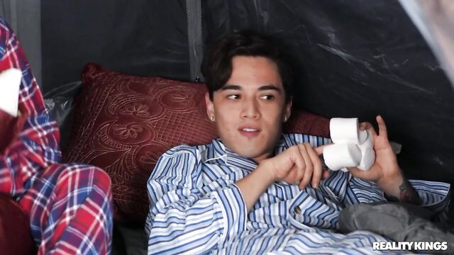 वर्णन: College chums Ricky and Juan are having their annual indoor camp-out in Ricky's living room; a jolly event full of shadow puppets, marshmallows and looking at porn on their phones. Things get a bit awkward when Ricky's dad comes home with a date, the stunning Britney Amber. Ricky and Juan promise to keep the noise down, as Ricky's dad leads a bewildered Britney upstairs. As the night goes on, Ricky and Juan get turned on by their porn and start humping marshmallows (as one does while camping); Britney goes downstairs to investigate after being awoken by their moans. Shock turns to horniness when Britney sees how big Ricky and Juan's dicks are, compared to her disappointing date's. It's a camping trip no one will ever forget!
