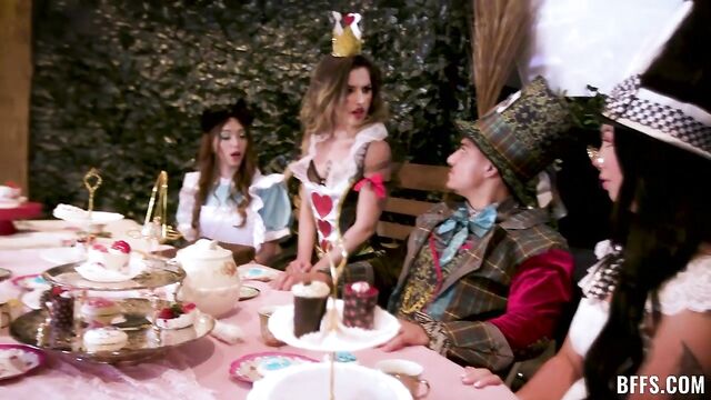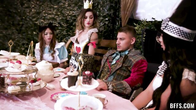 Description:Myra is a stranger in a strange land after falling down a hole. In this wild land, everything is topsy-turvy and willy-nilly. Nothing makes any sense, and the characters are all looney. Myra stumbles upon Victor and Holly enjoying a tea party in the garden. It’s an unbirthday celebration, which is a new custom for Myra. The tea party is interrupted by Chanel, the queen. She wants in on the fun, too, as no tea party is complete without a queen. Victor eats a cookie which makes his cock grow long and hard. The girls want a piece of Victor’s cock for themselves, so they all get down on their knees to take turns sucking him off. His shaft is huge, but the babes have no issue fitting him in their mouths. As Victor pumps their mouths full of his cock, Myra, Holly, and Chanel get wetter and wetter. Like a good mad hatter, Victor pleases each of them by pounding their pussies. A good raw fucking is just what this tea party needed to be elevated to the next level. As a final treat of the afternoon, Victor cums hard and lets each babe have a little taste.