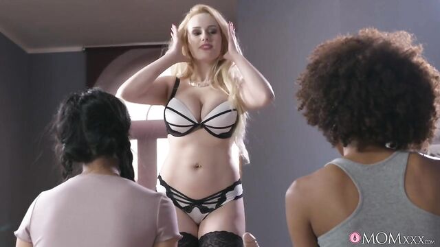 Description:As soon as busty MILF Angel leaves the house, hot babysitters Davon and Luna kick off their shoes to go explore. After finding a strap-on dildo and pretty pink vibrator in the bedroom, randy Davon strips off her jeans to pleasure herself, then suggests they put the toys back where they found them. But sneaky Luna has a better idea. The horny duo wait until Angel returns, then confront her with the plastic dicks, demanding to know what they're for. When Angel asks what she can do to keep them quiet, the dominant teens have the flustered mama eat their tight pussies. In the steamy interracial threesome that follows, Angel strap-on fucks each of her enterprising employees, her big natural tits bouncing with every thrust, until she makes them cum so hard she knows they'll keep her naughty secrets.