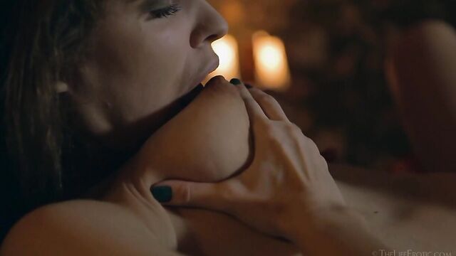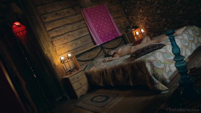 Description:Maverick auteur Paul Black once again teams up with regular muse Emily J for another wild, erotic fantasy. Curvy brunette Emily is resting on a large bed in a room decorated with an Indian influence. She's naked aside from a tiny white lace thong. Woken by the bustle of life going on outside her window, she stretches, then begins to caress one of her breasts, teasing the nipple. She pulls down her thong, stretching it between her splayed thighs, and licks and sucks on her tits. As her arousal increases, her thighs and crotch tremble with erotic tension. She reaches down, trailing her fingers through her trimmed mound and onto her shaved pussy. At first she takes things slowly and gently, barely dipping a fingertip between her smooth lips. Then she takes off her thong and moves her lithe body into a yogic folded plow position, bringing her legs up and back so she's resting on her shoulders with her ass in the air and her knees on either side of her head. She licks her fingers, wetting them with saliva that she smears on her pussy, then she uses both hands to stretch and probe her slit and asshole. She continues to tongue her spit-slick breasts as she masturbates, letting out moans and laughs of pleasure as her excitement builds. Next, she takes a large makeup brush and works the handle in and out of her pussy, pumping and stirring it. Finally, after working herself into a quivering, erotic frenzy, she cums, soaking her inner thighs and splashing her breasts and face as she squirts.