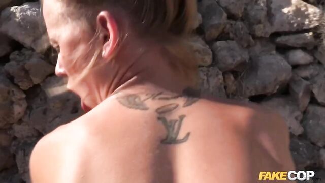 Description:It takes a lot of nerve to talk back to a uniformed police officer, but this bird Carmel Anderson was as brassy as it gets. Initially, I followed and pulled her over for littering, but when she started to get lippy, I got her out of the car to search her. After bending Carmel over the hood of my car, where the dash-cam could see right down her shirt, I started patting her down for anything suspicious, and got a nice grab of the meat of her ass cheeks. Carmel seemed to get horny as I teased her. She loved every minute of the attention from a man in uniform, and she reached out to grab the stiff bulge my hard cock was pressing in my trousers. I reclined my seat all the way so she could put her mouth on my boner, and she showed me how a British slut gives a proper deepthroat blowjob. Moving things to the backseat, I rammed my cock home in Carmel's fanny, squeezing her cheeks as she rode me reverse cowgirl!
