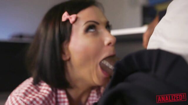 Description:Sexy brunette Alysa Gap knelt before Yves Morgan, unzipping his suit pants eagerly! Out sprang a massive ebony cock making her gasp???? She looked so ready to worship that beautiful black meat. She wrapped her lips around shaft. Sucking sloppily, she gagged herself balls-deep until he grunted ready! Yves bent the petite blonde over kitchen island spreading cheeks wide???? He buried his face between asscheeks eating out tight hole enthusiastically! Tongue probing deep into puckered starfish while Alysa squealed in delight. Then, his thick pole speared into wet cunt pounding away wildly???? Her huge tits bounced as Yves railed doggy style hammering pussy into submission! Suddenly he pulled out ramming balls-deep up that tiny asshole instead! Stretching it obscenely open with girthy cock????He was set on wrecking her shitter! Alysa moaned getting anal destroyed on countertop. The stud pounded relentlessly until she couldn't take it any longer. Then he made her kneel in front of him and glazed Alyssa's face white with giant load! What an intense interracial sodomy scene!!
