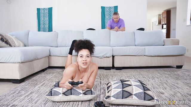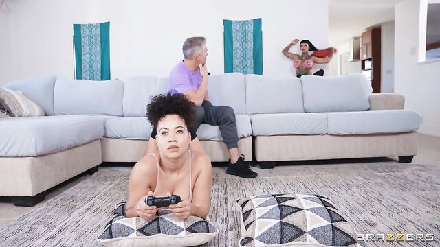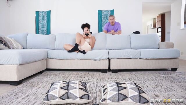 Description:Mick Blue and his girlfriend are going head-to-head gaming. When Mick loses, he tries to get some action, but girlfriend don’t wanna play that game. She wants to beat his high score! Mick turns to see Jessie Lee watching, flashing her tits. Jessie pops up behind the couch with her mouth open and pussy ready. Sneaky sex ensues as beige gamer gf is too busy to see what’s happening right behind her back.