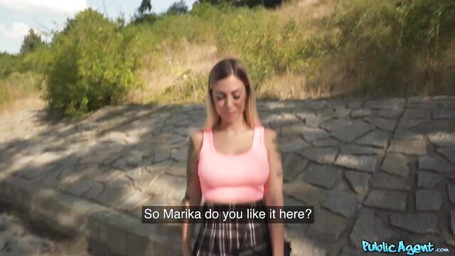 Description:Today I met this sexy tattooed blonde named Marika Milani, who was happy to stop and chat. After handing over some cash, the Italian beauty flashed me her big boobs, and she even let me squeeze them! I gave Marika a few more euros for a blowjob, and then she bounced her tight pussy on my cock in cowgirl before taking a doggystyle pounding. I spanked her curvy ass hard as I fucked her from behind, and then the filthy minx spread her legs and invited me to bang her in missionary until I came on her tongue!