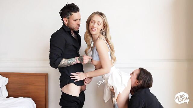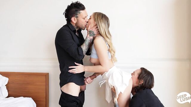 Description:After 5 years we reconnect with Sky Pierce for a fun and hot threesome. Small Hands and I can't help but put our hands all over her incredible body while we kiss, lick her pussy, and she strokes our cocks between us. We move to the bed and get undressed as Small Hands and I take turns fucking her. We bring in a hitachi and help give her multiple orgasms. The scene ends with Small Hands fucking her in missionary until he shoots his cum all over her body. I finish with having sex in missionary until I cum deep inside of Sky with a close up of my cum dripping out of her.