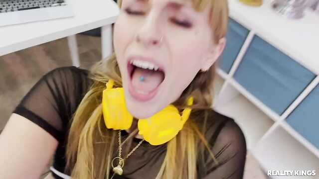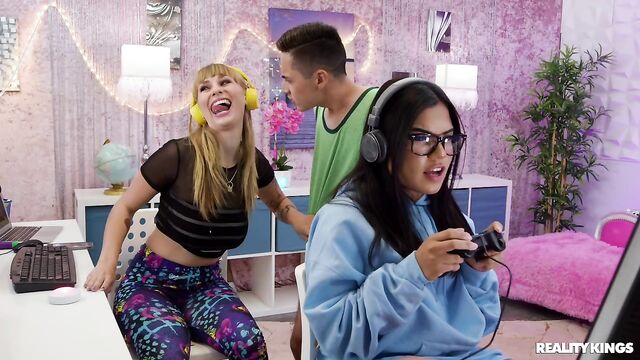 Description:Sexy streamer Angel Youngs is flashing her big tits and playing with her pussy on stream for her fans, right behind her gamer roommate's back. When her roomie's boyfriend Juan Loco comes in to watch his GF game, Angel decides to incorporate him into her show, sucking his big dick on cam and riding it! Juan's gf doesn't notice a thing as Angel's big tits and ass bounce right behind her back! Once she leaves, Juan can really pound Angel's pussy and cum all over her face!