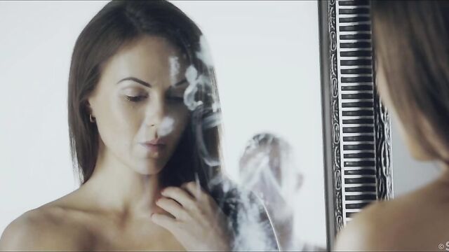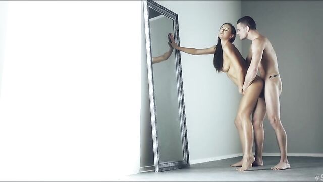 Description:Gorgeous brunette Tina Kay and studly Maxmilian Dior drive each other wild in Andrej Lupin’s erotic movie "Sychronize." Tina studies her stunning naked body in a full-length mirror as she explores her perfectly shaved pussy with her fingers. Her breath quickens as she rubs her clitoris fervently, licking her fingers to taste herself, squeezing her beautiful breasts and bringing herself to a powerful orgasm. Catching her breath, she looks at her reflection to see sculpted stud Maximilian approaching her. Already naked, he presses against her from behind and fondles her lustfully as she strokes his shaft to full hardness. They watch themselves in the mirror as they use their hands on each other; Tina’s moans fill the dreamlike room as Maxmilian enters her from behind, lifting her leg to expose her filled pussy while he thrusts into it forcefully. She rocks back to meet his strokes, smiling delightedly, then turns and presses her firm ass against the mirror as she guides his cock back inside her soaked pussy. They kiss as he fucks her toward the edge, then surprises her by dropping to his knees to lick her sensitive slit, exploring with his tongue until she can barely stand it. Athletic Maxmilian arches his body into a table position and encourages Tina to ride him. She loses herself in ecstasy again and again as she slides up and down on his rigid cock, her incredible ass rising and falling in his lap. Finally he stands and she bends over to take his huge erection in her mouth, sucking it deep and jerking his hot load out over her tanned tits. They admire her cum-streaked reflection in the mirror together, two perfectly matched, high-energy fuckbuddies.
