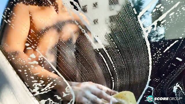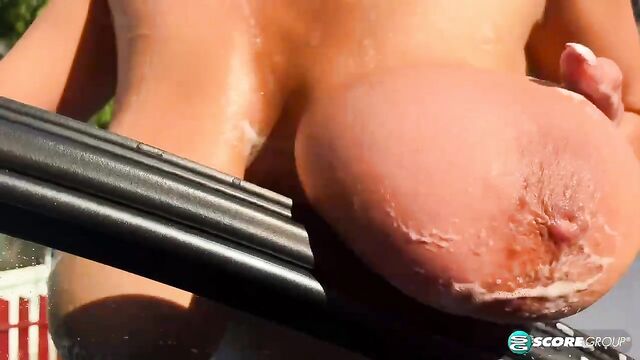 वर्णन: Helen Star made our car wash dreams come true with this soapy scene. This is old-school, sexy babe auto-buffing with a hose, sponge and bucket. No automated roller machines to drive into. We've got Helen wearing a white tank that sticks to her lovely body and bikini bottoms. This is high-quality car maintenance. And the black-haired Romanian beauty does it in sky-high heels. Amazing. What a chassis. What a fantastic, load-bearing framework. Look at those bumpers. And the car is good-looking too. "I like to play in the shower," said the always cheery and happy Helen. She seems to be attracted to water. "I like to sing in the shower, too. I dream of having sex in a pool. "I like a lot of attention and I think it's fun to see men losing their minds over me and my cleavage. I like to dress very sexy, but it doesn't matter what I put on, my boobs stick out. Guys are always asking me questions about my body."